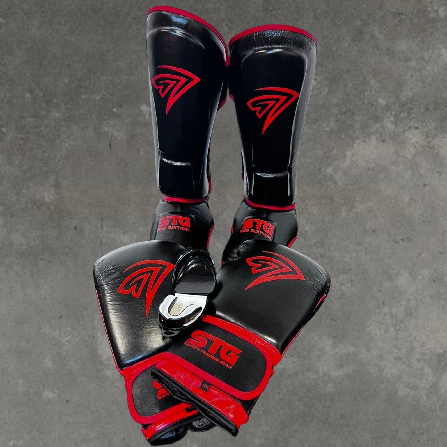 Unleash your potential with our Ultimate Fighter's Package! Elevate your game with 1 pair of Red Edition boxing gloves, 1 pair of matching shin guards —all crafted from genuine leather and a high-quality mouthguard. Don't miss out on this exclusive deal to gear up in style and performance. Seize the discount now and conquer the ring!